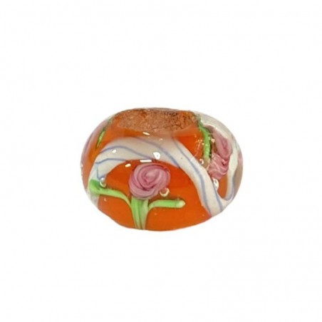 Cuenta cristal murano 14 x 8 mm para cordón 5 mm. Naranja con flores rosas