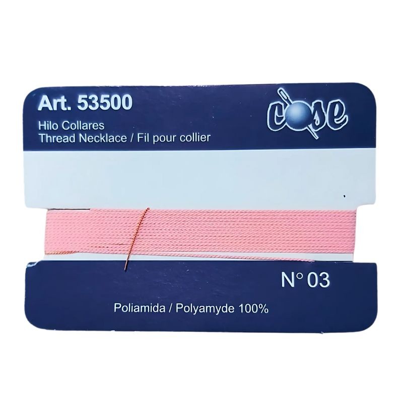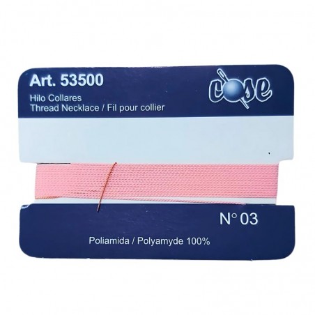 Hilo para en filar collares del nº3 en color rosa con aguja incluída. 2 metros de largo.