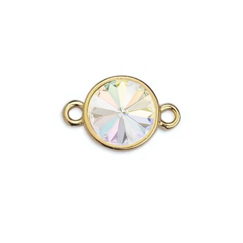 Entrepieza en zamak bañada en oro con cristal color Crystal AB. Le recomendamos pegar ambas piezas con nuestro pegamento especial para joyería con referencia 7405.