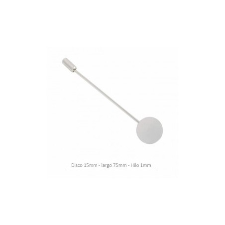Pincho con disco liso y tapón, de tamaño grande, en plata de ley. La bolsa contiene 1 unidad. El largo es de 75 mm. y el diámetro del disco es de 15 mm.