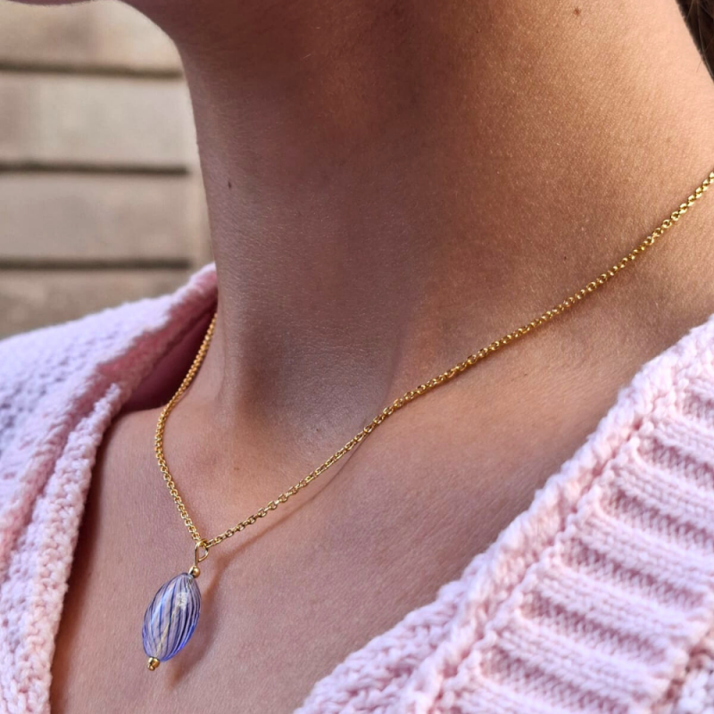 Cristal soplado en forma de gota de 13x8mm en color azul con rayas. Taladro interior de 1mm.