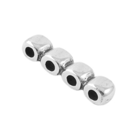 Separador cubo de 4 cuerpos en zamak con baño de plata. La bolsa contiene 1 unidad. El tamaño es de 33x7x7 mm. y es para cordones de 3 mm.