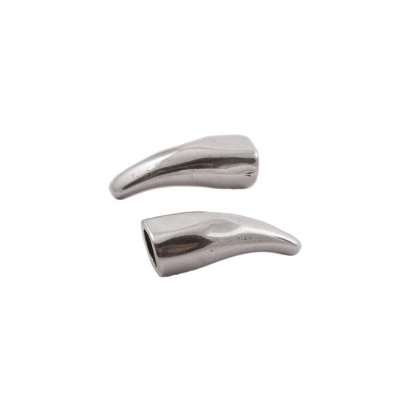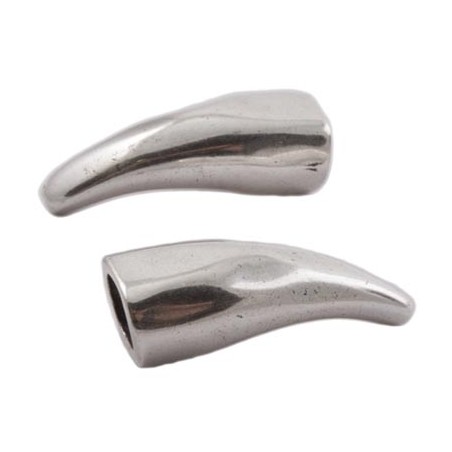 Terminal liso, de zamak con baño de plata. La bolsa contiene 2 unidades. El tamaño es de 34x14 mm. y es para cuero de regaliz hueco.