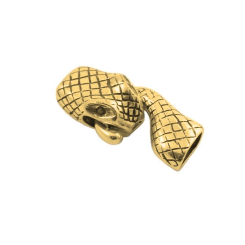 Cierre de serpiente de zamak con baño de oro. La bolsa contiene 1 unidad. El tamaño es de 44x18 mm. y es para cuero regaliz de 10 mm.