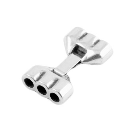Cierre pulsera para 3 cordones de 5 mm de zamak con baño de plata. La bolsa contiene 1 unidad. El largo es de 38 mm. y tiene unos taladros de 5 mm.