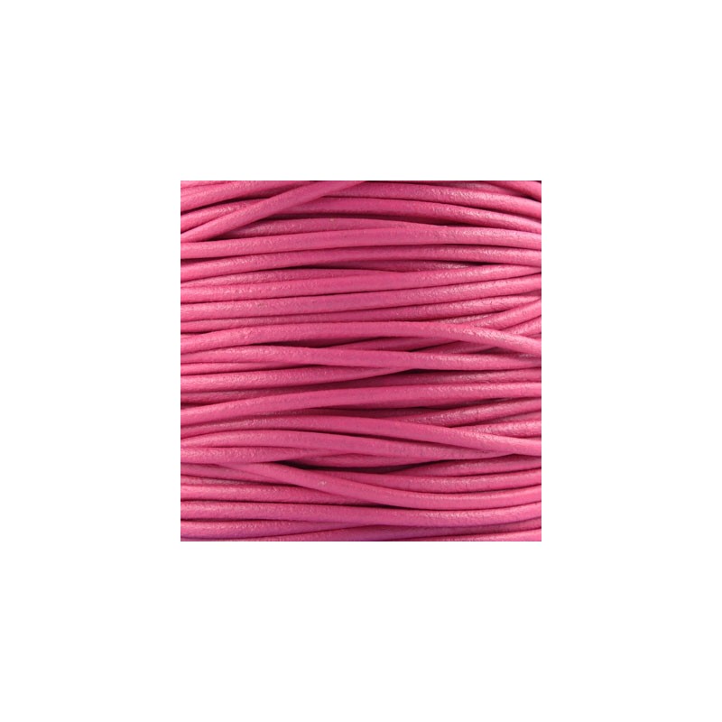 - Cuero redondo de 3 mm de grosor en color fucsia, fabricado en España. Este cuero es de alta calidad y es ideal para hacer pulseras y colgantes. A la hora de hacer nudos, al ser más grueso cuesta un poco más que con tamaños más pequeños.