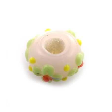 Cuenta cristal murano 15 x 8 mm para cordón 5 mm. Rosa palo con flores amarillas.