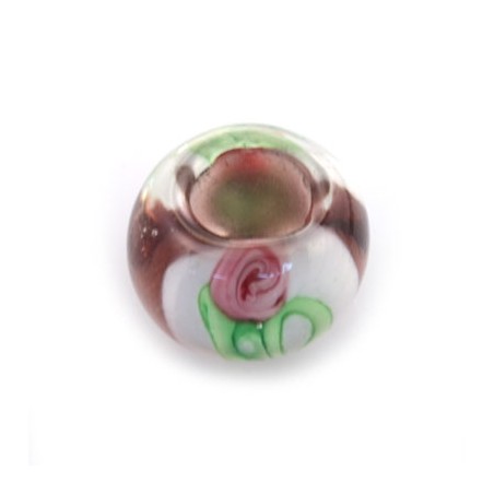 Cuenta de cristal murano 12 x 8 mm para cordón de 5 mm, en color vino con estampados florales.
