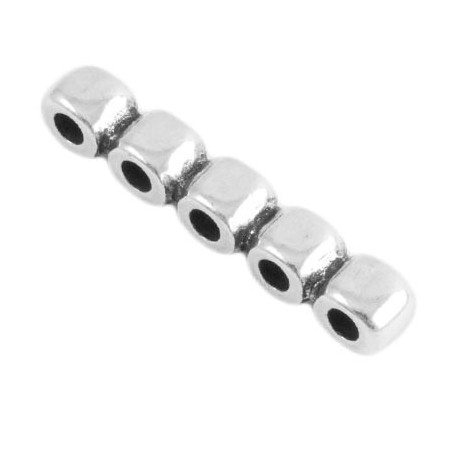 Separador tubo de 5 cuerpos en zamak con baño de plata. La bolsa contiene 1 unidad. El tamaño es de 34x7x7mm y es para cordones de 3 mm.