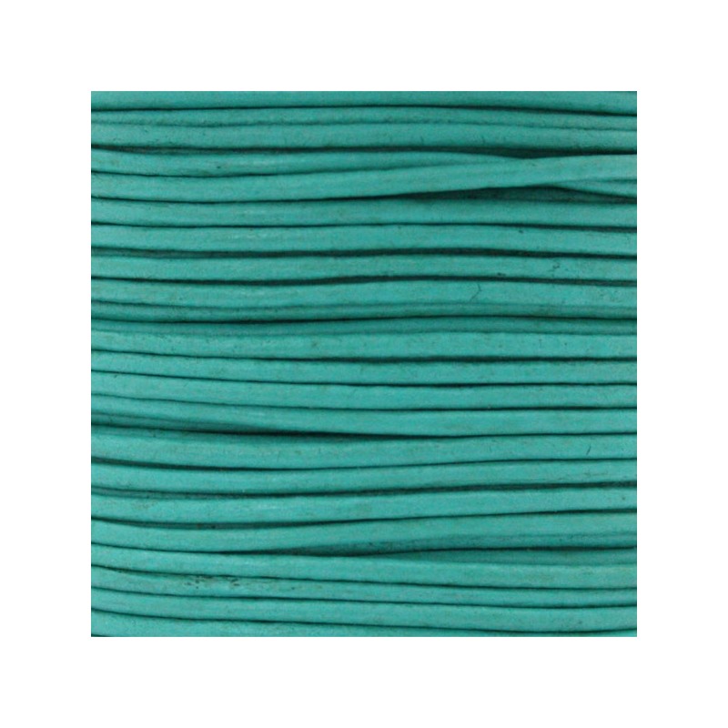 - Cuero redondo de 1 mm de grosor en color verde turquesa. Este cuero es muy suave y flexible siendo ideal para hacer nudos o bien para llevar pulseras y colgantes muy finos.