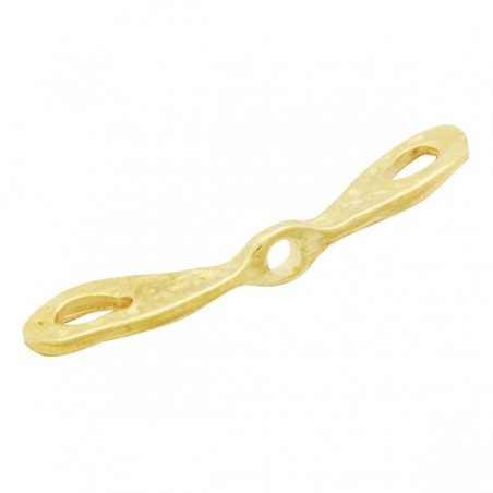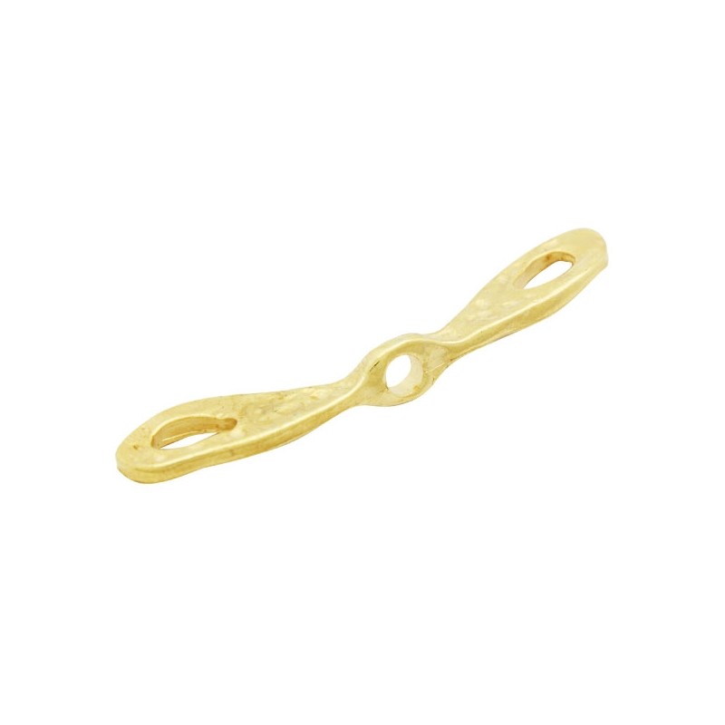 - Entrepieza media ala en zamak con baño de oro. - El tamaño es de 51,5x10 milímetros y tiene un paso de 3 milímetros. - El precio es por bolsa y la bolsa contiene una unidad.