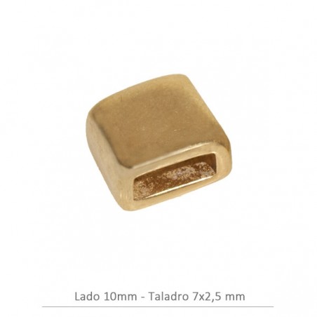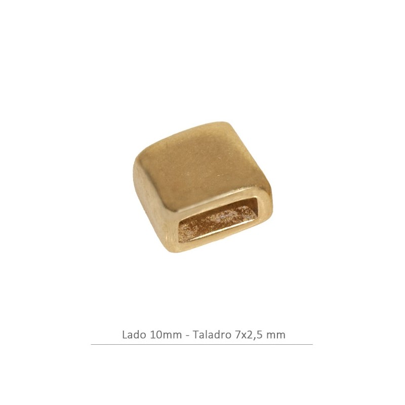 - Cuadrado en zamak con baño de oro. - El tamaño es de 7x7 milímetros y el taladro interior es de 2,5 milímetros. - El precio es por bolsa y la bolsa contiene 2 unidades