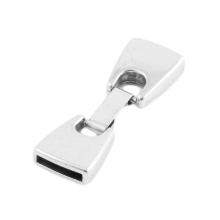 Cierre con lengüeta en zamak con baño de plata. La bolsa contiene 1 unidad. El tamaño es de 32x20 mm. y es para cinta plana de 10 mm.