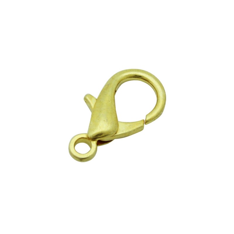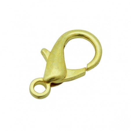 - Mosquetón de latón en color dorado. - El tamaño es de 15 milímetros y tiene un taladro aproximado de 1 milímetro. - El precio es por bolsa y la bolsa contiene 5 unidades.
