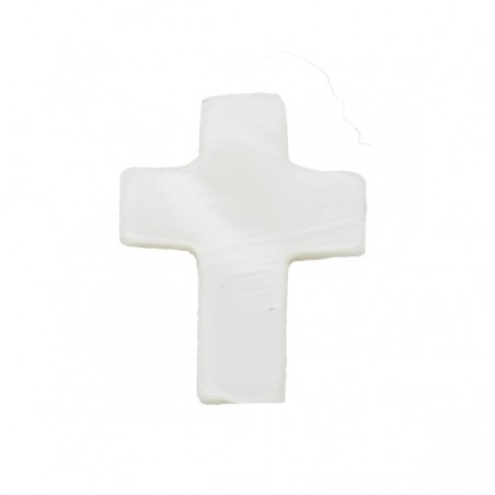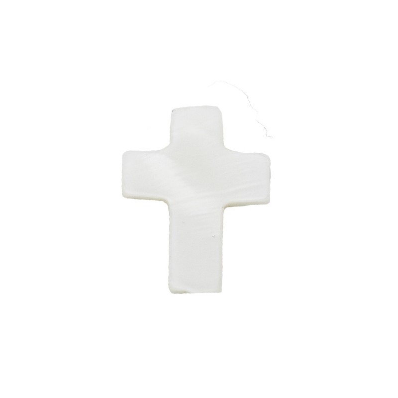 Cruz de nacar en color blanca. La bolsa contiene 2 unidades. Tamaño 14x11mm y el taladro de 0,9 mm.