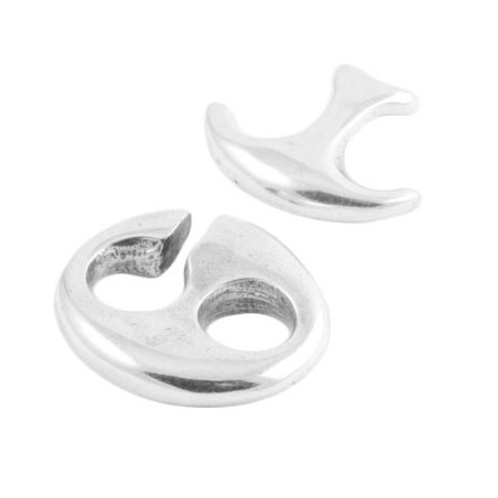 Cierre calabrote en zamak con baño de plata. La bolsa contiene 1 unidad. El tamaño es de 29x25 mm. y los taladros son de 10 mm.