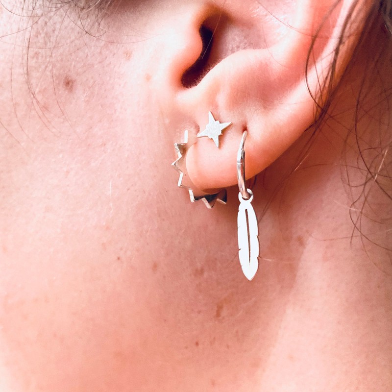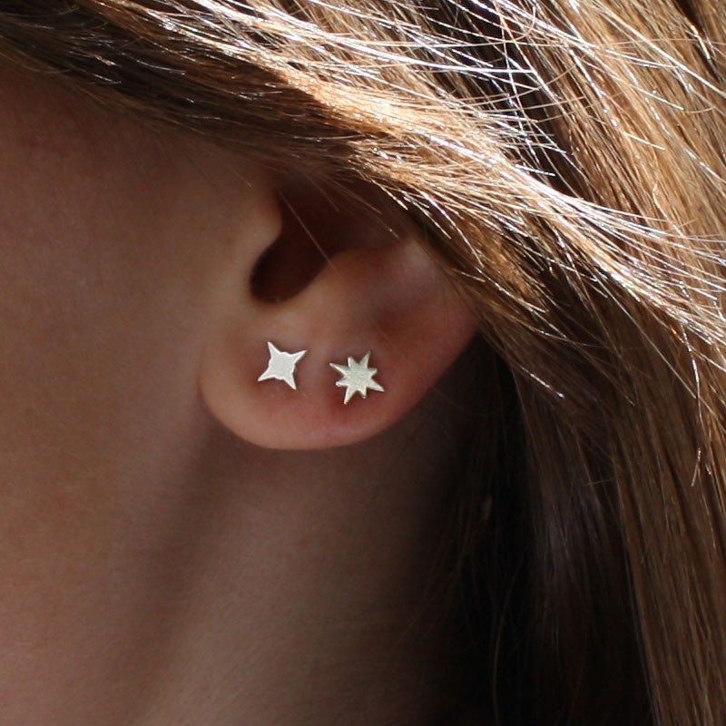 - Pendiente estrella de cuatro puntas en plata de ley. - Su tamaño es de 6,5 mm. - El precio es por bolsa y la bolsa contiene 2 unidades con 2 presiones.