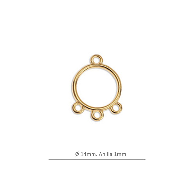 Entrepieza aro con 3 anillas en zamak con baño de oro. La bolsa contiene 2 unidades. El tamaño es de 14 mm.