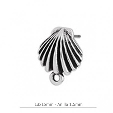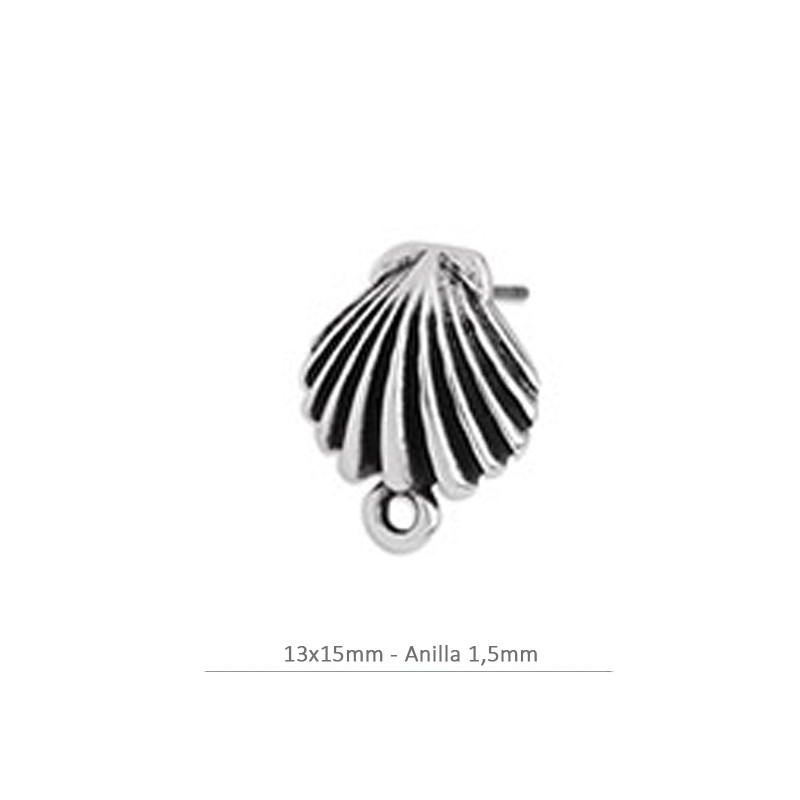 Pendiente concha de 13x15mm con anilla. Zamak bañado en plata. La bolsa contiene 2 unidades y 2 presiones.
