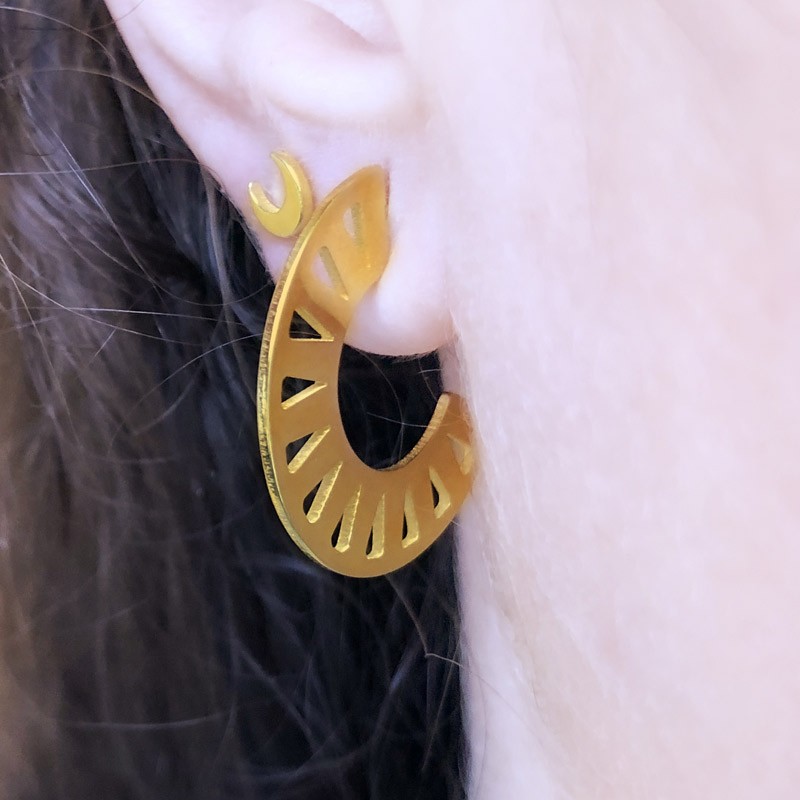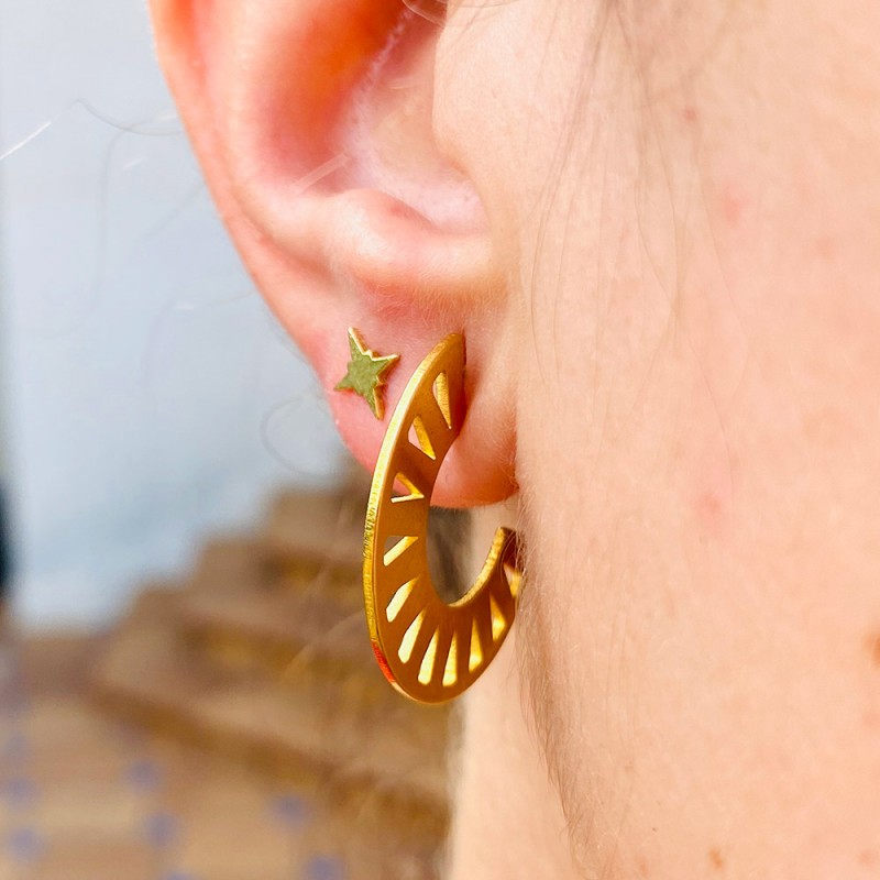 - Pendiente criollas étnicas plata de ley con baño de oro. - Su tamaño es de 26 mm - El precio es por bolsa y la bolsa contiene 2 unidades con 2 presiones.