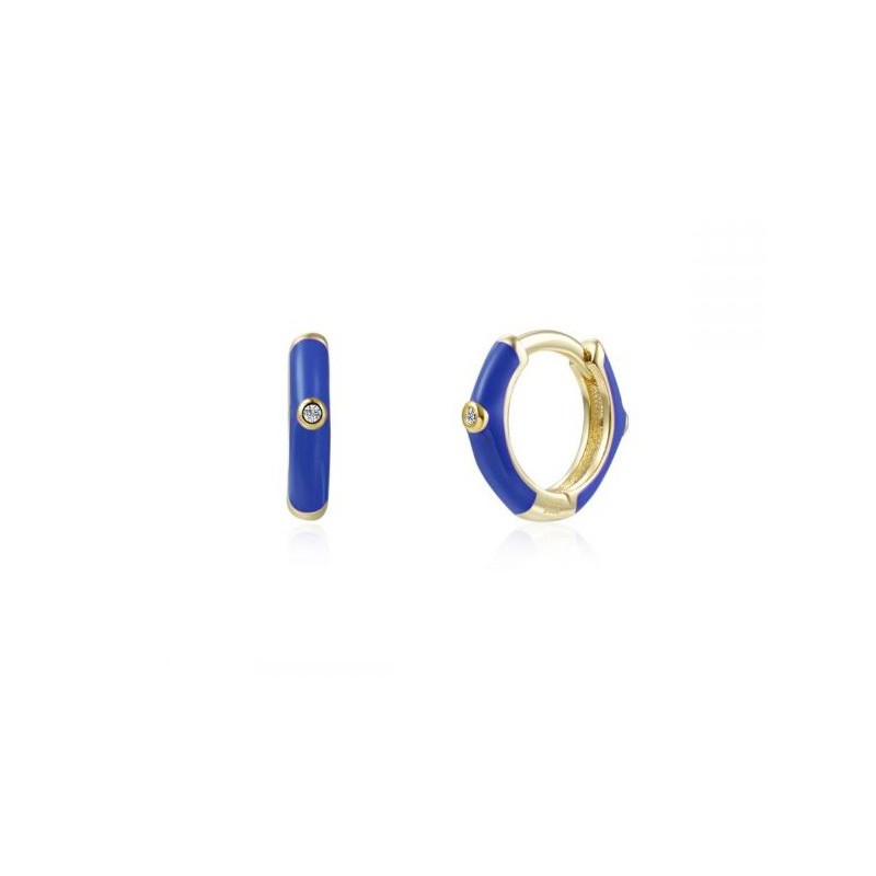Pendientes criollas automáticas en plata de ley 925 bañada en oro de 18k con circonita blanca y esmaltado azul cobalto.