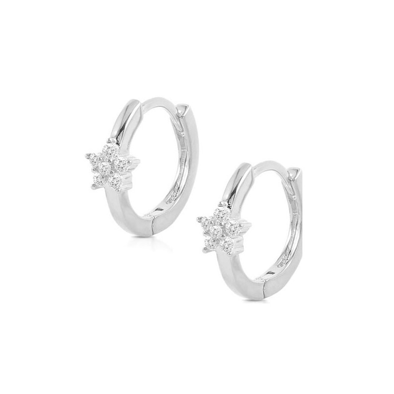 Pendientes criollas automáticas con flor de 4 puntas con circonita blanca en plata de ley 925.