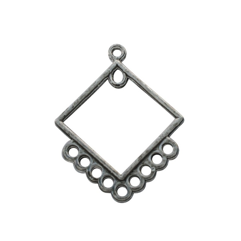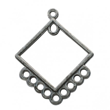 Entrepieza rombo con 10 anillas de latón en color plateado. La bolsa contiene 2 unidades. El tamaño es de 40 mm. y las anillas son de 3 mm.