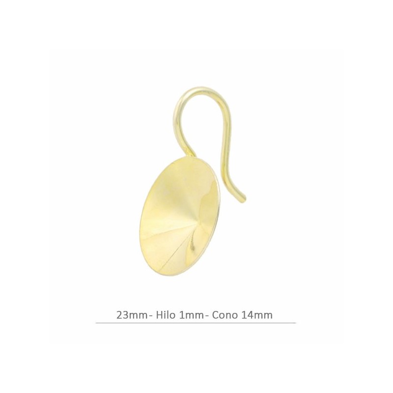 Pareja de pendientes de gancho en plata de ley 925 bañados en oro de 18k con cono de 14mm en la zona de abajo para cristales de Swarovski redondos modelo rívoli.