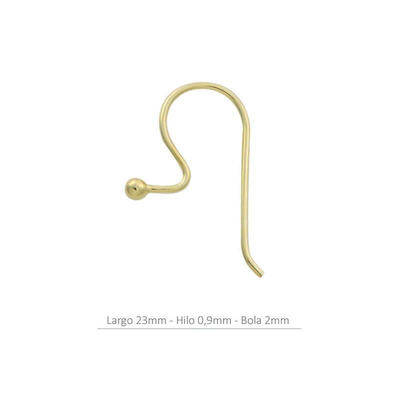 Gancho con bola,de plata con un baño de oro. La bolsa contiene 2 unidades y el tamaño es de 23x10 y el diámetro de la bola es de 2 mm.