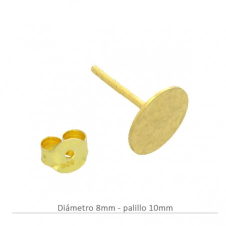 Pendiente disco plano de 8 mm y palillo de 11 mm bañado en oro. Contenido: 2 pendientes y 2 presiones.