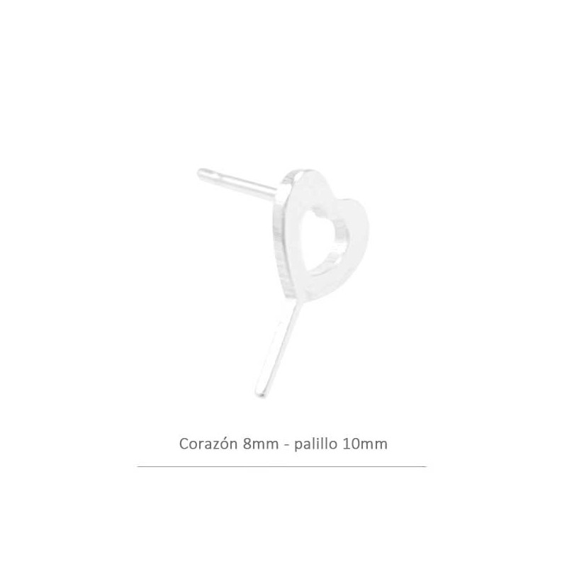 - Pendiente corazón en plata de ley con palillo inferior. - Tamaño de 8 milímetros. - La bolsa contiene 2 unidades y 2 presiones.