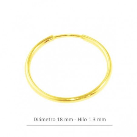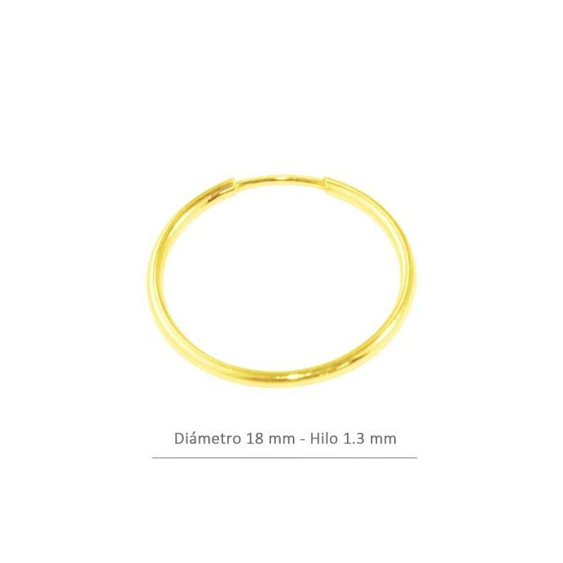 - Pendientes de aro en plata baño oro. - El diámetro exterior es de 18 mm y el hilo es de 1.3 mm. -El precio es por bolsa y la bolsa contiene dos unidades