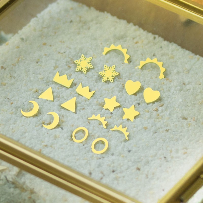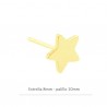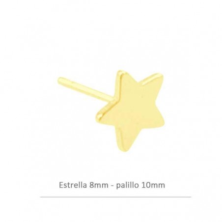 - Pendiente estrella en plata baño oro. - Tamaño de 8 milímetros y palillo de 10 mm. - La bolsa contiene 2 unidades y 2 presiones.