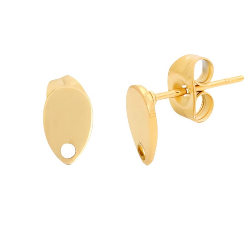 Fornitura de pendiente en forma de lágrima de 8 mm de largo y 5 mm de ancho con agujero de 1,3mm en acero inoxidable dorado.