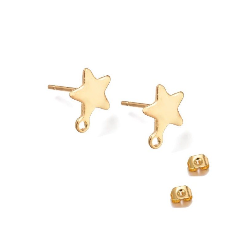 Fornitura de pendiente de estrella de 8,5mm de ancho y 10,5mm de largo en acero inoxidable dorado, incluye presiones. Asa de 1,5mm cerrada.
