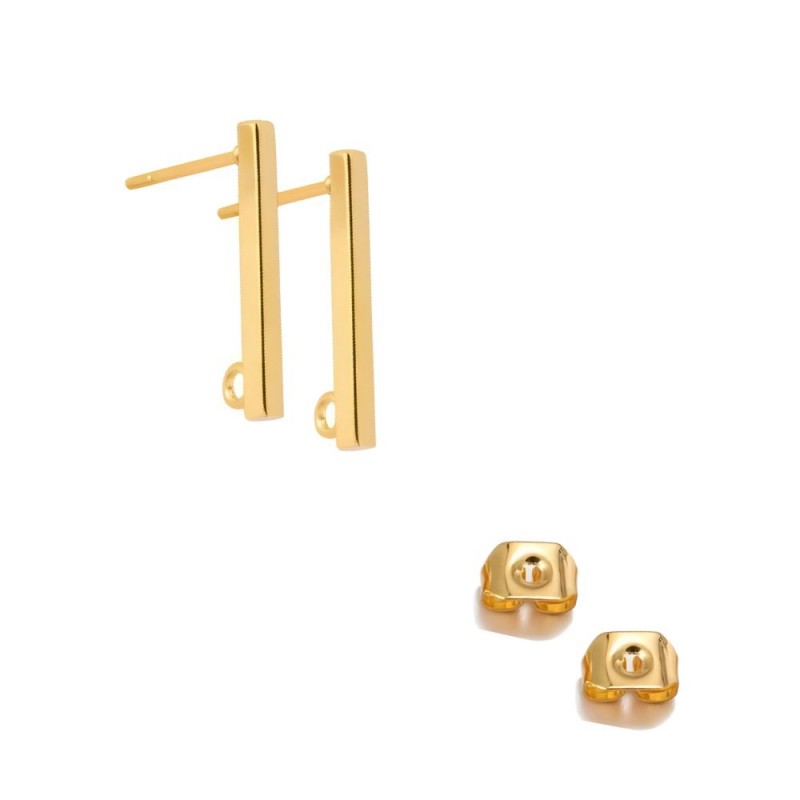 Fornitura de pendiente con palillo largo de 20 mm con anilla trasera escondida en acero inoxidable dorado.