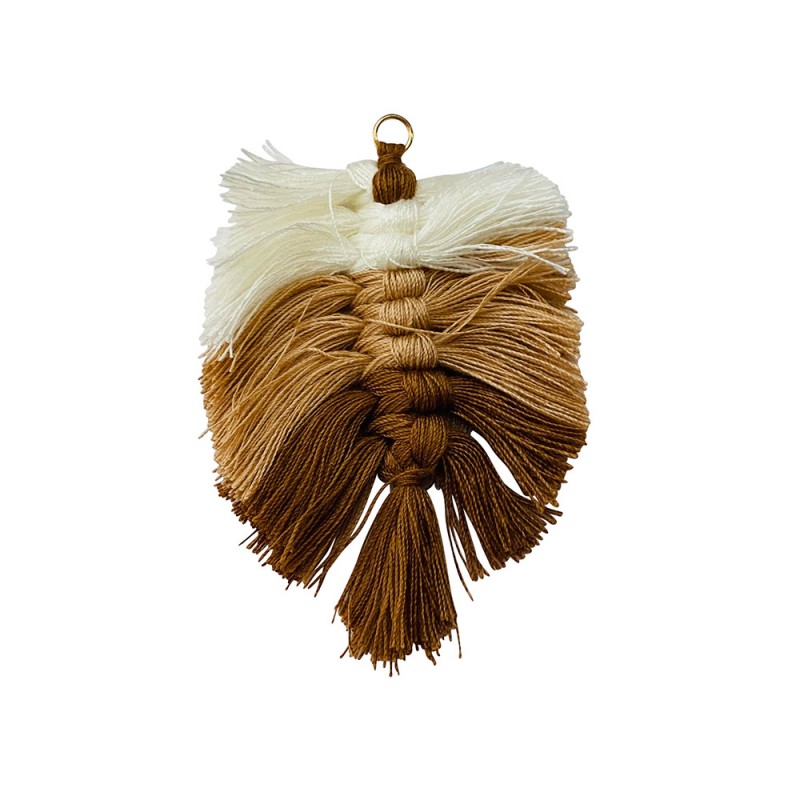 - Borla monstera en color marrón degradado con anilla bañada en oro integrada en la borla.
