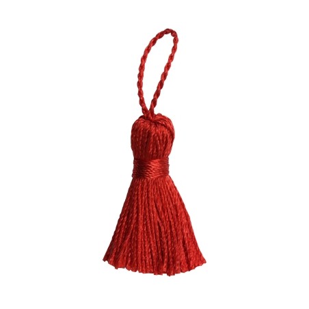 Pompón de raso en color rojo. La bolsa contiene 1 unidad y el tamaño de la borla es de 3 mm.