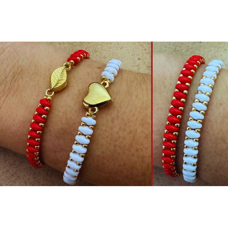 Con este kit podrás crear estas dos pulseras de con cuentas superduo y rocallas 11/0 en color rojo, blancas y doradas. Es muy fácil y divertido de hacer.