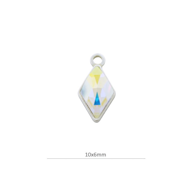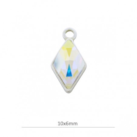 - Colgante rombo en plata con cristal de Swarovski. - El tamaño es de 10x6 milímetros. - El cristal está incluido en el precio. - El precio es por bolsa y la bolsa contiene 2 unidades.