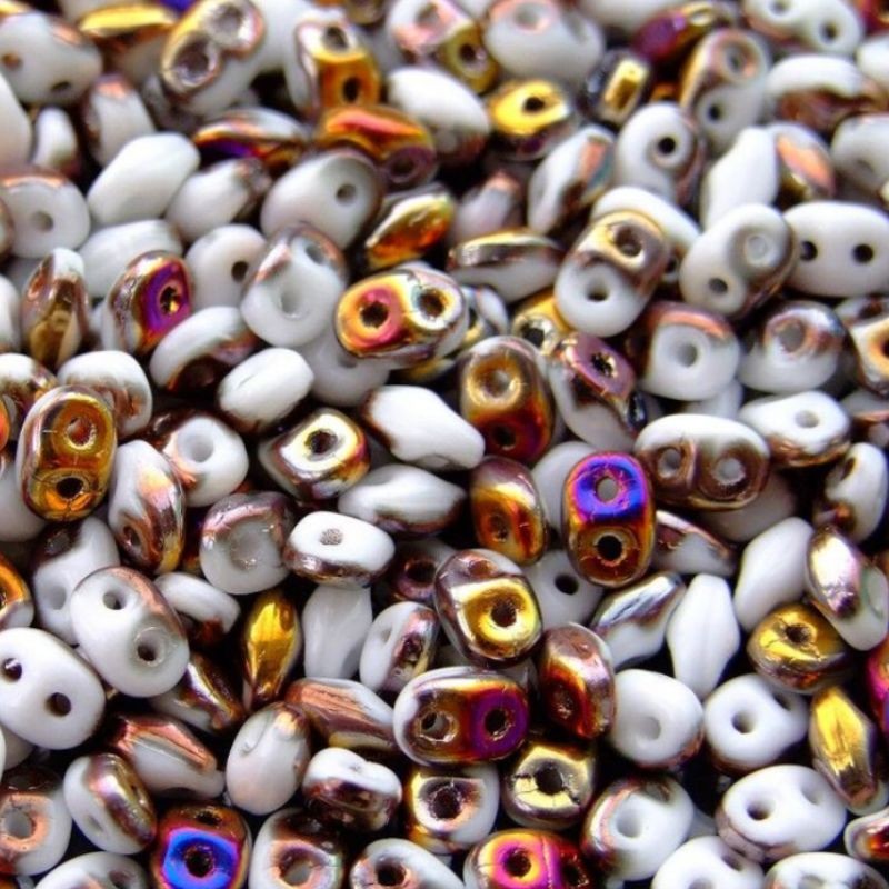 Las cuentas superduo son las cuentas de semilla con dos agujeros en forma de rombo ovalado con los cantos redondeados. Las cuentas son uniformes.
