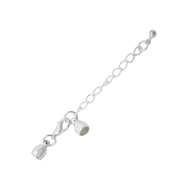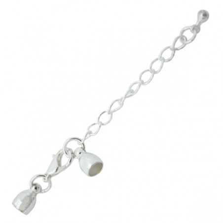 Mosquetón con caireles y alargador de latón en color plateado. La bolsa contiene 1 unidad y es para cordón de 4 mm.