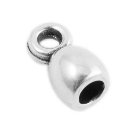 Terminal campanilla con anilla en zamak con baño de plata. La bolsa contiene 2 unidades. El tamaño es de 6x11 mm. y es para cordón de 3 mm.