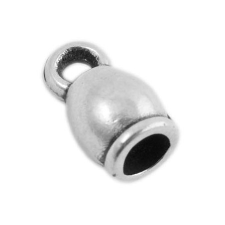 Terminal campanilla con anilla en zamak con baño de plata. La bolsa contiene 2 unidades. El tamaño es de 6x11 mm. y es para cordón de 3,5 mm.