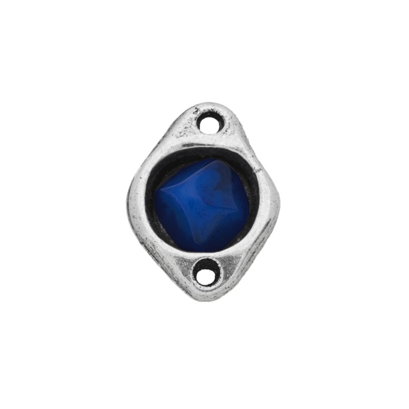 Entrepieza con dos asas en zamak con baño de plata con resina Swarovski en color azul. Le recomendamos pegar ambas piezas con nuestro pegamento especial para joyería con referencia 7405, ya que no vienen pegadas.
